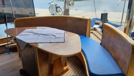 Die schön ausgestattete Larus aus massivem Holz verfügt über ausreichend Sonnenmatratzen mit integrierten Kopfstützen und Sonnensegel am Vorderdeck. Die Esstische befinden sich unter einem Sonnensegel im Heckbereich und im Salon. An der Bordseite der Larus befindet sich eine Badeleiter.